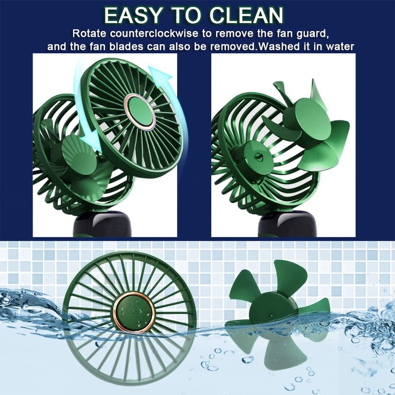 - 【Easy To Clean】Mini Fan front mesh cover with rotary button detachable design,Remove by turning counterclockwise,The blades are also removable for cleaning. (Note: the fuselage cannot be washed directly). The handheld fan base can hold the phone,While watching TV series,relieving summer heat and relieving heat,freeing hands.
