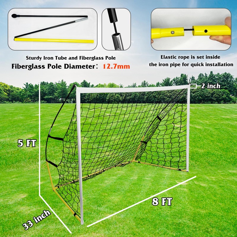 - 【Portable Soccer Goal】The full size for soccer goal with net is about 8*5ft. It can meet the needs of kids, teenagers and adults for soccer training and improve kicks, pass control and shoots skills.