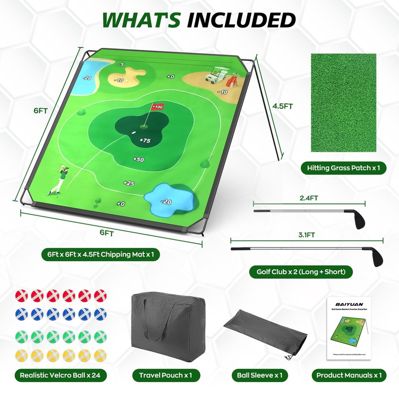 - [ Ultimate Golf Gifts ] This all-in-one golf chipping game set is where golf dreams take flight - the hole-in-one gifts that delights every swinger from teens to grandparents! Includes everything needed for instant play. Surprise golf enthusiasts with enjoyment! More than a gifts: It's 24/7 course access wrapped in one genius mat