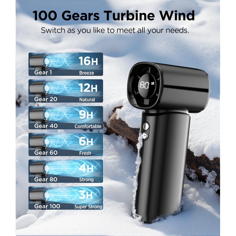 • SUPERIOR WIND POWER: The powerful portable turbo fan features an advanced 5-blade design with a high-speed brushless motor that can reach a maximum speed of 30,000 RPM, which is 5 times the speed of a regular handheld fan, providing you with a powerful and stable wind experience