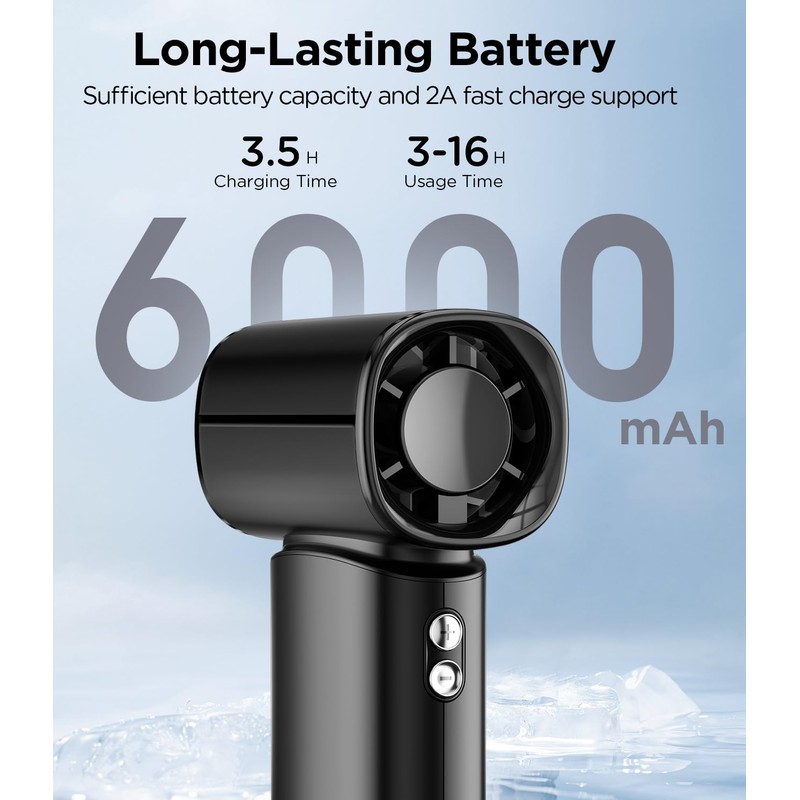 • LONG BATTERY LIFE: The handheld mini fan is equipped with a 6000 mAh battery capacity that provides up to 16 hours of battery life to keep you cool on the go. The rechargeable battery fan is compatible with regular USB ports, portable mobile power and car chargers for a seamless charging experience