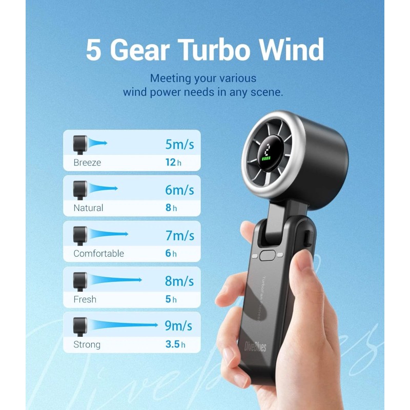 Portable Handheld Turbo Fan, 5 Gear Wind, Battery Operated, up to 12 Working Hou