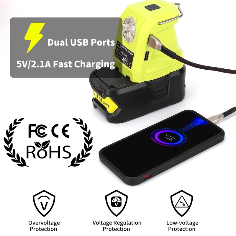 - Power Bank: The camping light can also serve as a power bank for smartphones or mobile devices in emergency. Battery adapter equipped with 5V/2.1A dual rechargeable charging port for quick and convenient charging.