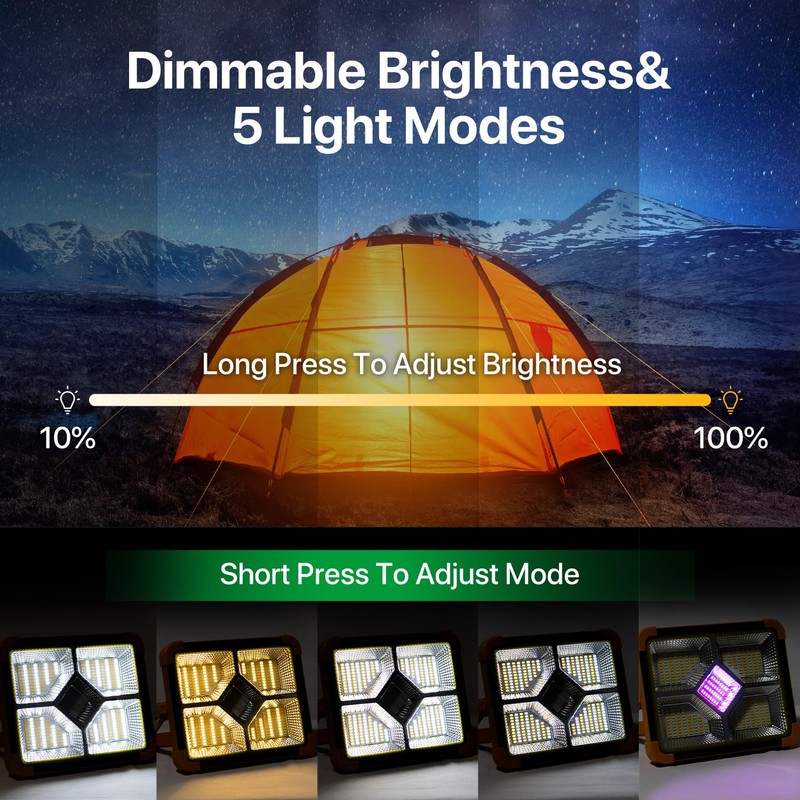 - [5 ADJUSTABLE BRIGHTNESS MODES]: Solar rechargeable work light provides 5 lighting modes - Mode 1. warm white; Mode 3. high brightness warm white; Mode 4. medium warm white; Mode 5. red/blue strobe. It meets long-term lighting needs and displays power levels of 25%, 50%, 75% and 100%. Switch use - short press to select mode, long press to turn off