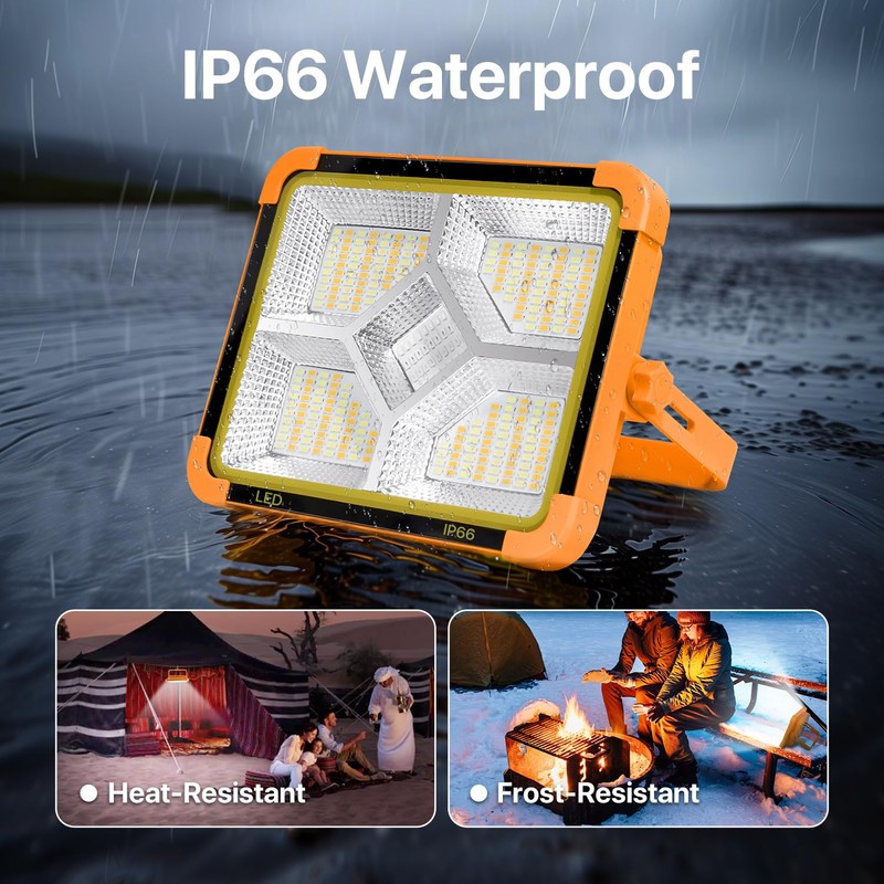 - [EASY TO CARRY]: The rechargeable flood light has a 180° swivel handle for adjusting the lighting area, it also comes with a hidden hook, tripod holes and back magnets for multiple ways to carry and use.IP66 waterproof rating protects the light from everyday splashes. Emergency Worklight for camping, fishing, hiking, barbecuing, auto repair, garage lighting, workshop lighting and more indoor and outdoor activities