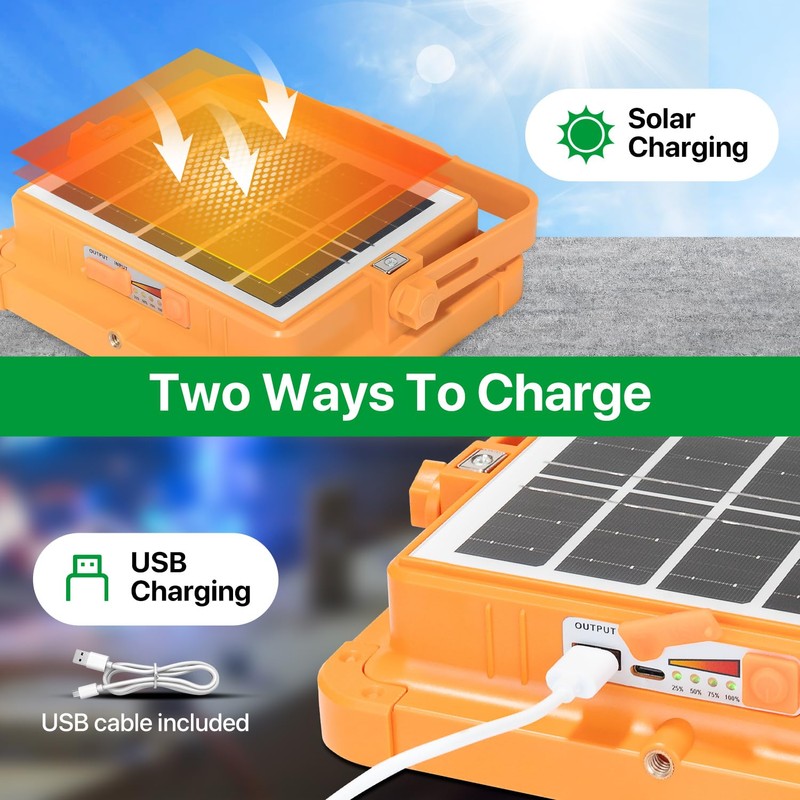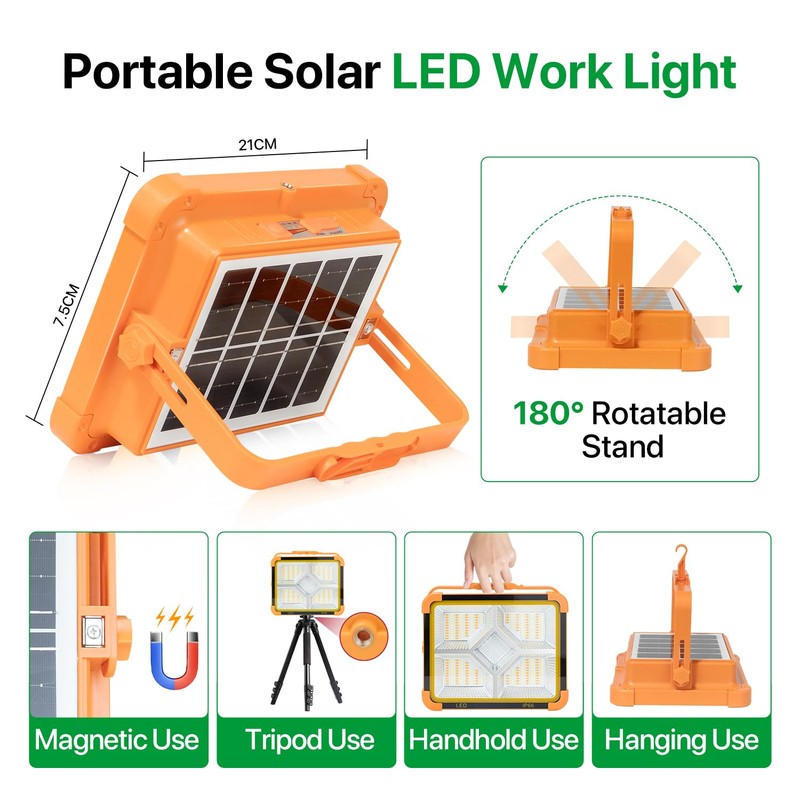 - [2 CHARGING METHODS]: The solar work light features a 16500mAh rechargeable battery that can also be used as a storage battery in case of emergency, and can be used to charge electronic devices with the included 5V/2A USB cable. led work light rechargeable can also be recharged via the highly efficient solar panel on the back of the solar light, which achieves a solar energy conversion rate of up to 25%
