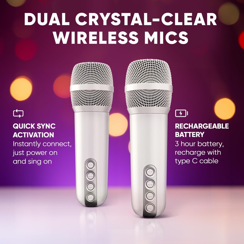 - π€ ππ¨ππ πͺππ₯ππππ¦π¦ π πππ₯π’π£ππ’π‘ππ¦ - Elevate your singing sessions with our karaoke machine's two integrated Bluetooth microphones. Designed for crystal-clear audio and hassle-free connectivity, these mics ensure every performance is heard loud and clear. Conveniently store both microphones directly on the machine after your duet or solo, making setup and storage a breeze. Dive into a world where your voice takes center stage with the perfect Bluetooth microphone pairing.