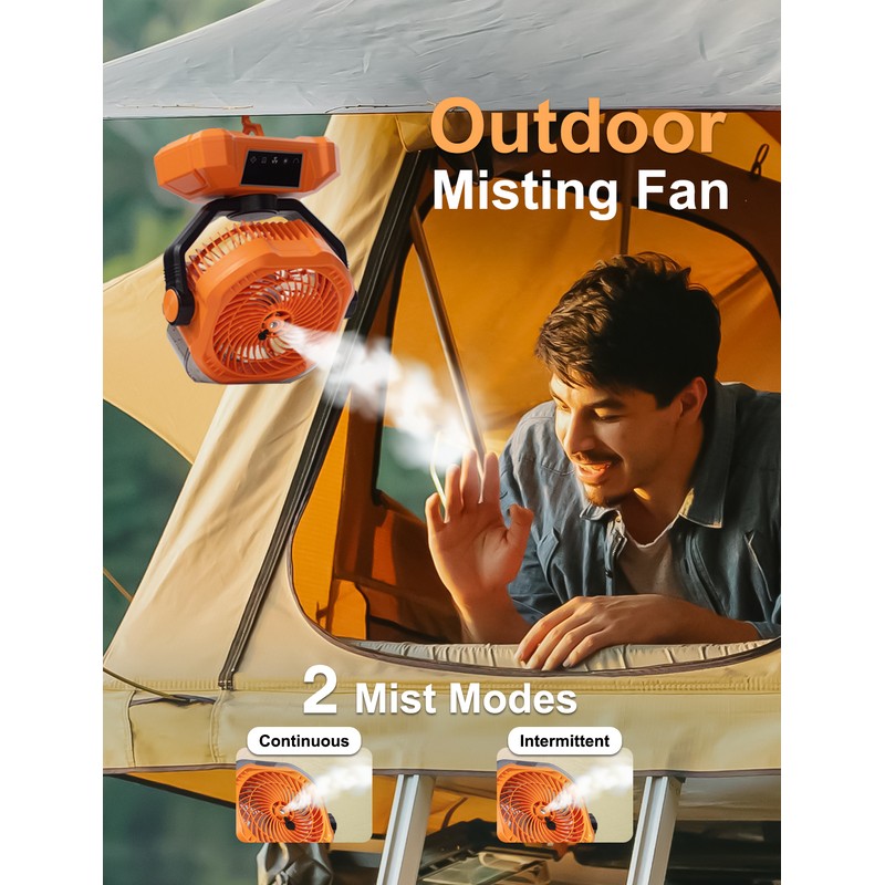 • Built-in Light & Misting Function: The fan features three adjustable lighting modes, allowing you to set the brightness for your tent or campsite. The misting function offers two levels: Mode 01 provides a continuous spray for instant relief, while Mode 02 delivers an intermittent mist to help keep the air cool.