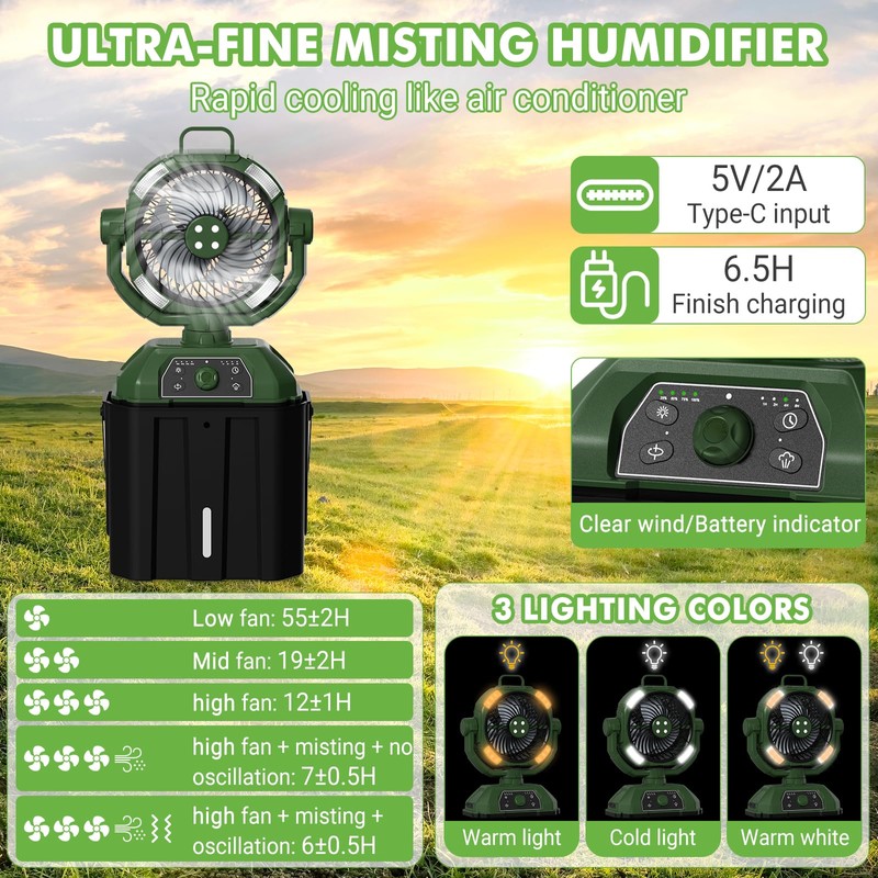 - Portable Misting System: Compared with traditional camping fan, the portable misting function allows you to feel the cool water misting on your skin while blowing the wind. The fine water misting can evaporate quickly in the high temperature environment of summer, making your skin feeling cool. The fan equipped with 4 large spray outlets, the air volume emitted is larger, the range is wider, and the distance is farther than single-hole misting fan.