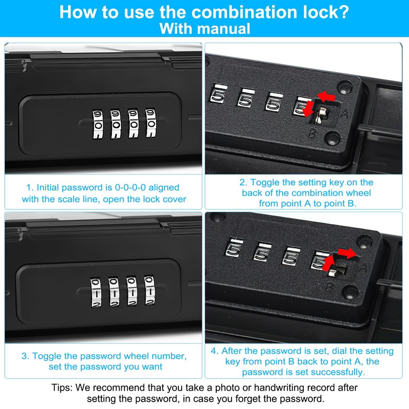 • Secure 4-digit password lock: the resettable 4-digit mini transport lockers provides up to 10,000 password combinations that are easy to remember and reset to ensure maximum security. The initial password of the lockable box is 0-0-0-0, you can follow the instructions to reset your own password, it is recommended to take a photo or write down the password after each reset, otherwise you cannot open the combination safe again.