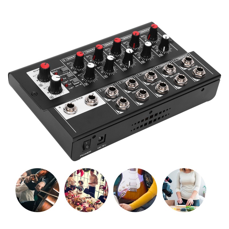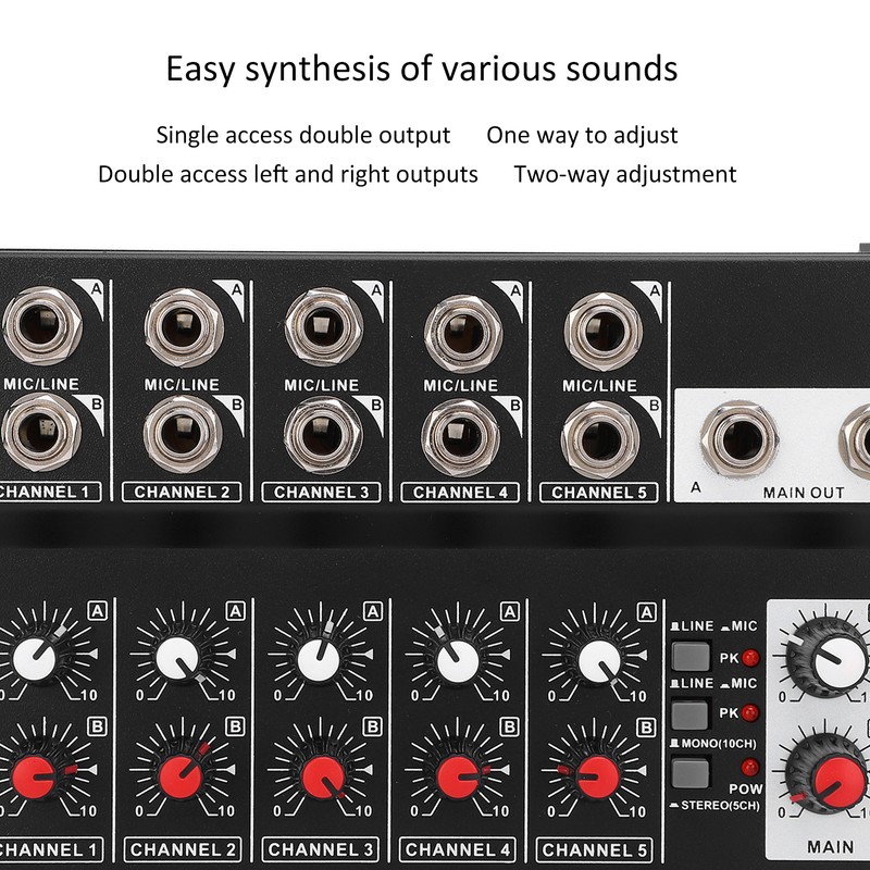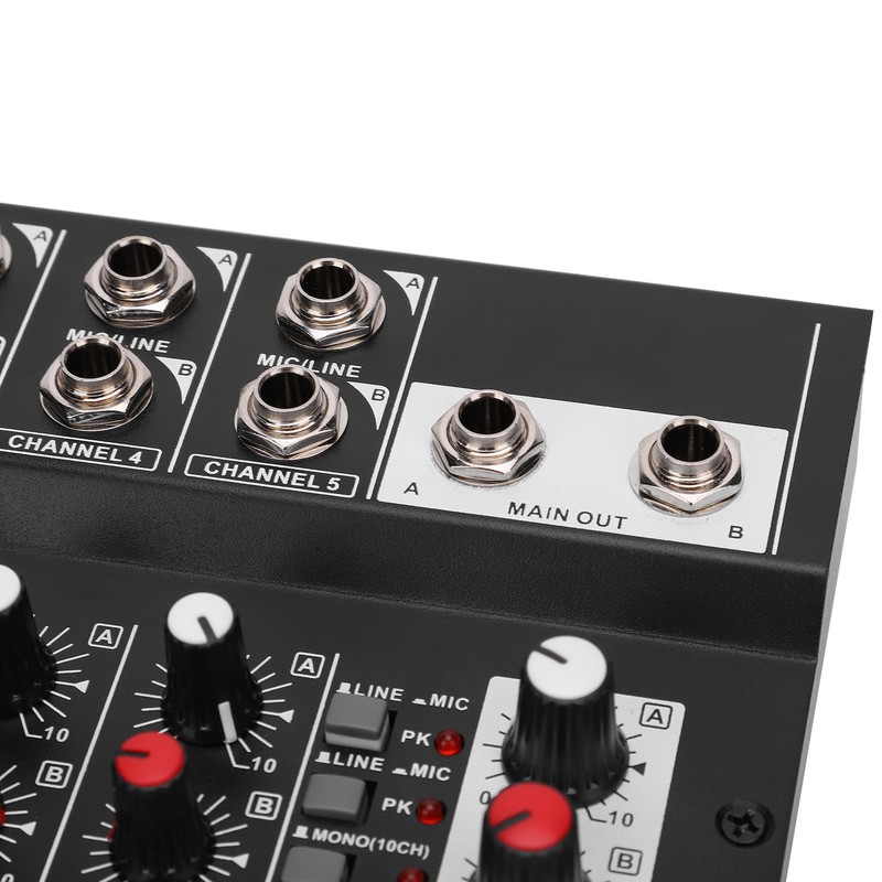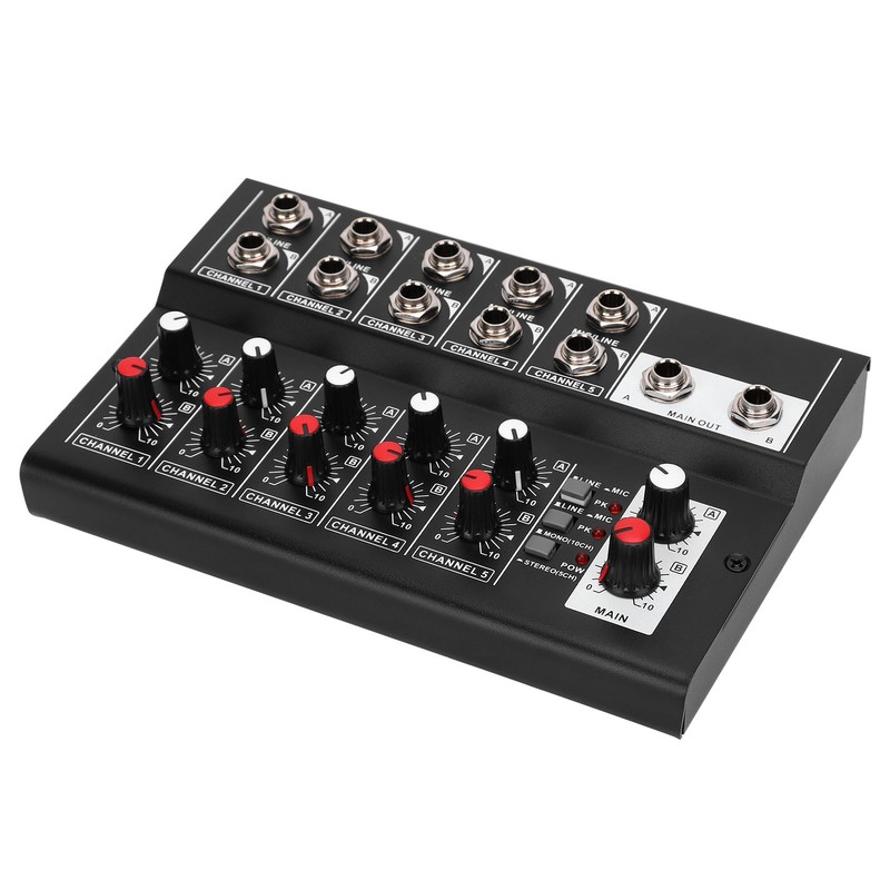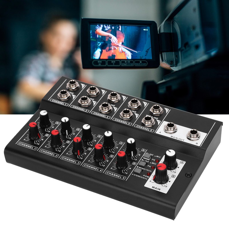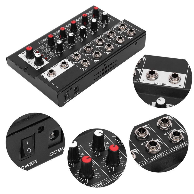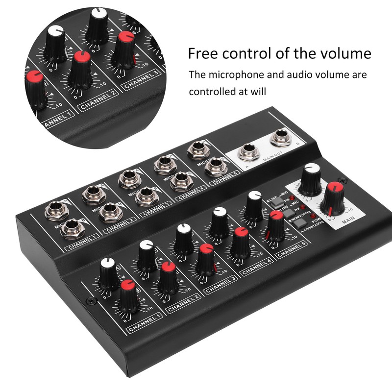 1、The audio mixer with 10 input channels and 2 output channels. 2、Supports the control of 5 channel volume and 2 output channel volume simultaneously. 3、Made of high quality alloy material, durable, compact and easy to carry. 4、Comes with anti‑skid pad make sure the control is not affected. 5、It can make the sound natural and stereo.