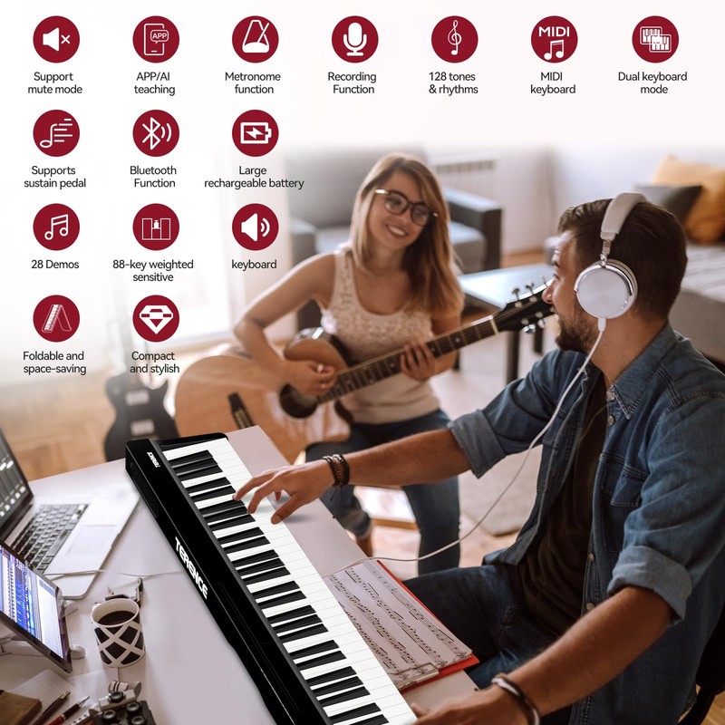 - 88-key Semi-weighted Keyboard: The piano is equipped with a full range of 88 keys that are sensitive to force, getting closer to the touch of a piano. Through different playing forces, from light keys to heavy keys, it can bring about a transition from a soft tone to a strong one and delicate changes in sound quality, from light to heavy dynamic sampling, making the sound reproduction more delicate and realistic! The 88-key foldable electronic piano supports the dual-player teaching mode.