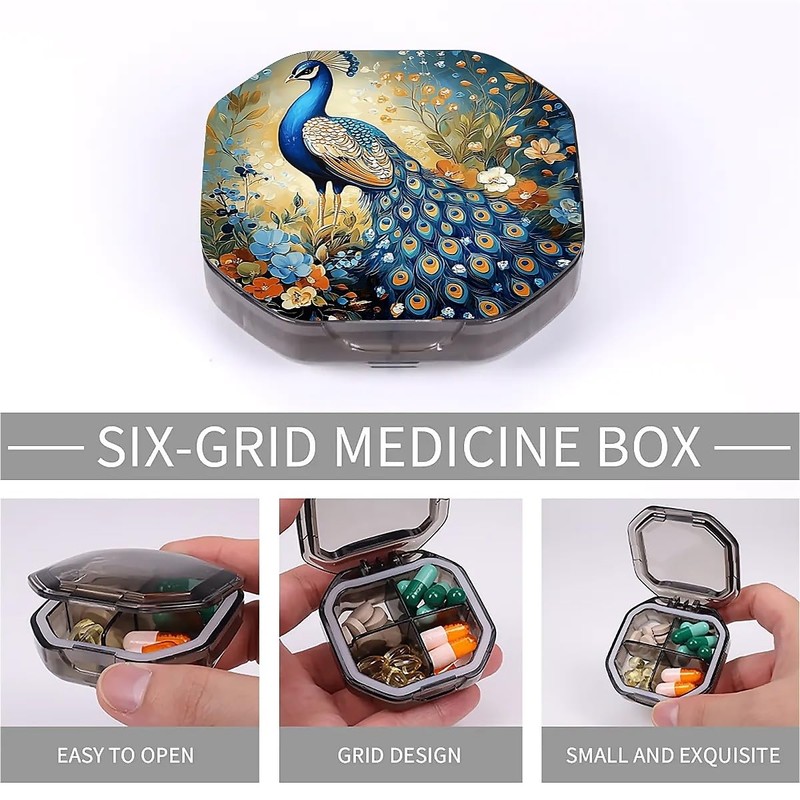 Portable pill box peacock pattern 4 grid pill box, travel small pill dispenser for travel and daily use