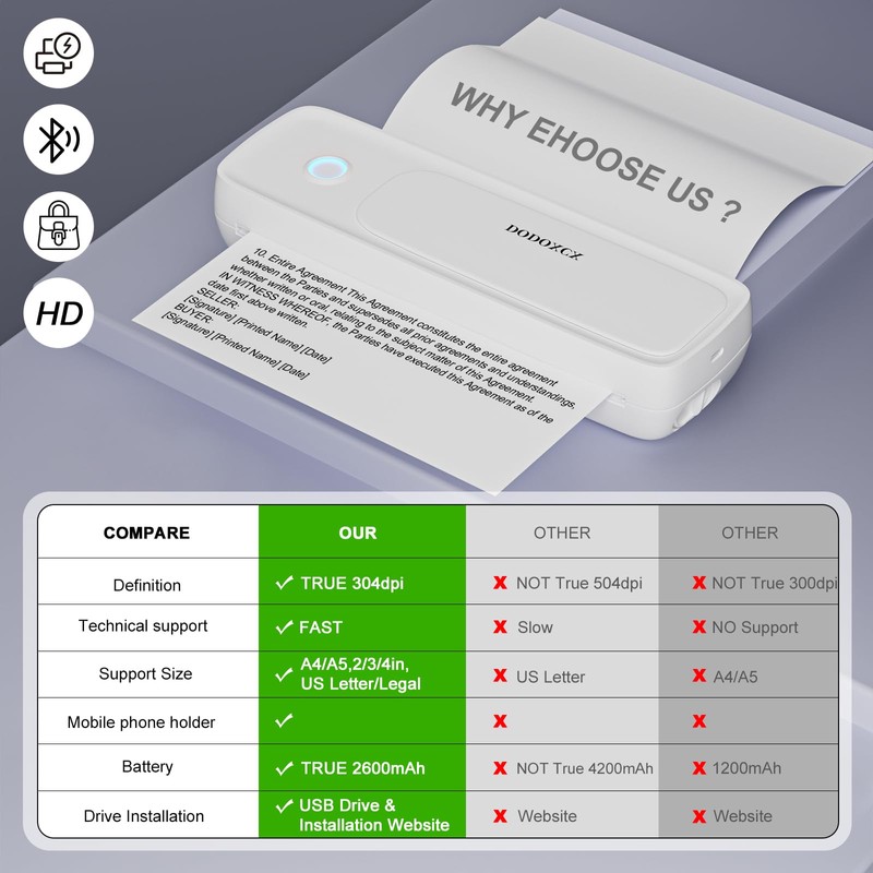 - 【Inkless printer】The mobile phone printers offers an economical solution for everyday printing needs, eliminating the need for ink, toner, and ribbons. Print recipes, forms, letters, assignments, study materials, and travel documents hassle-free with advanced thermal technology. Each thermal paper costs only $0.07, resulting in substantial savings of hundreds of dollars per year. Perfect for home, small office, and school use. (Note: DODOXCX Portable printer is a thermal printer and only supports thermal paper, not support regular copy paper)