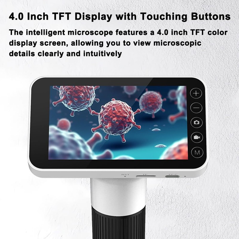 - 【4.0 inch TFT Display with Touch Buttons】The intelligent microscope has a 4.0 inch TFT colour screen, which allows you to view microscopic details clearly and intuitively. Thanks to the user-friendly design with two touch buttons on the base and screen, the microscope is designed for easy and quick operation and is suitable for both beginners and professionals.