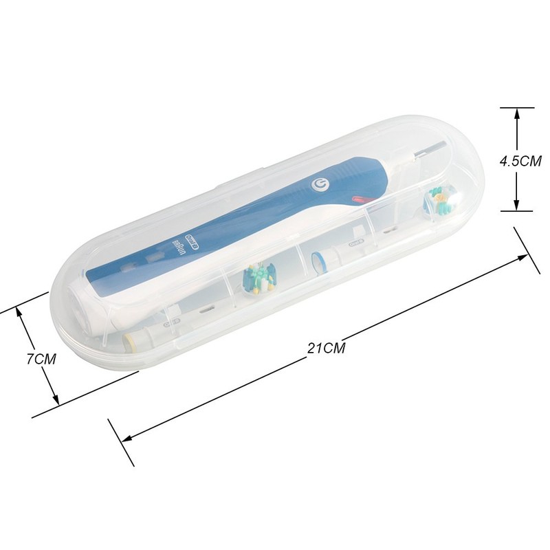 **Specially designed for Oral-b series.** **Features:** Reasonable design and structure to keep your electric toothbrush and electric toothbrush heads when you are traveling. Color: transparent. Material: food-safe plastic materials. Weight: 64g. Size:21x7x4.5CM. **Package Include:** 1 PCS Electric Toothbrush Case.Size:21x7x4.5CM. **Note:** Only the electric toothbrush Case, toothbrushes and brush heads are not included.