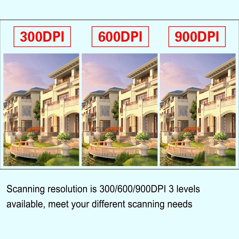 - 3 Resolution Modes This compact mobile document scanner has 3 resolution modes: 300dpi, 600dpi, 900dpi, which you can choose according to your needs.