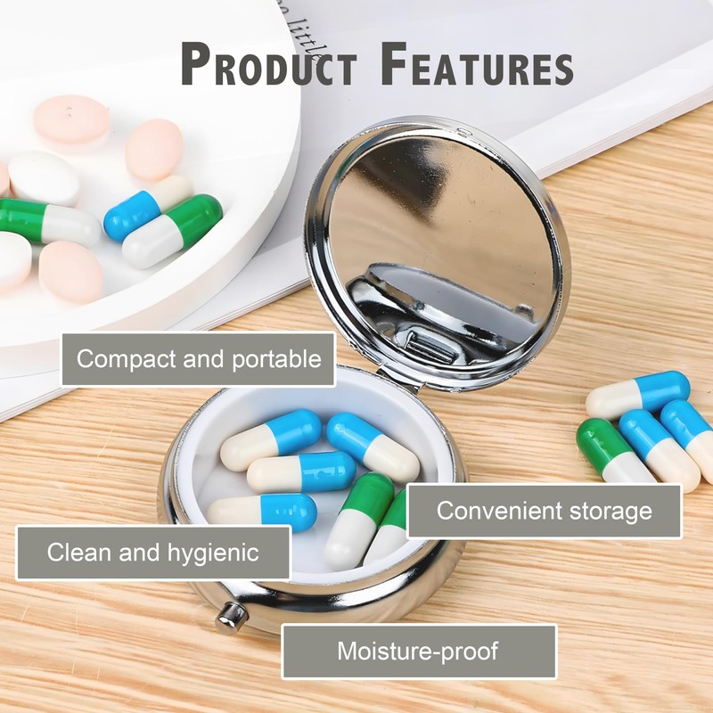 - Silver Round Pill Box: The mini pill box features a sleek silver round design that is both stylish and functional. Its small size and metal construction make it an excellent choice for keeping your medication discreetly organized and easy to access