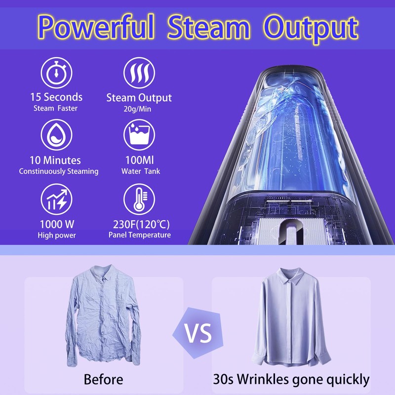 - Fast Heat-Up: This portable steamer for clothes quickly heats up in just a few seconds, allowing you to remove wrinkles efficiently and effortlessly