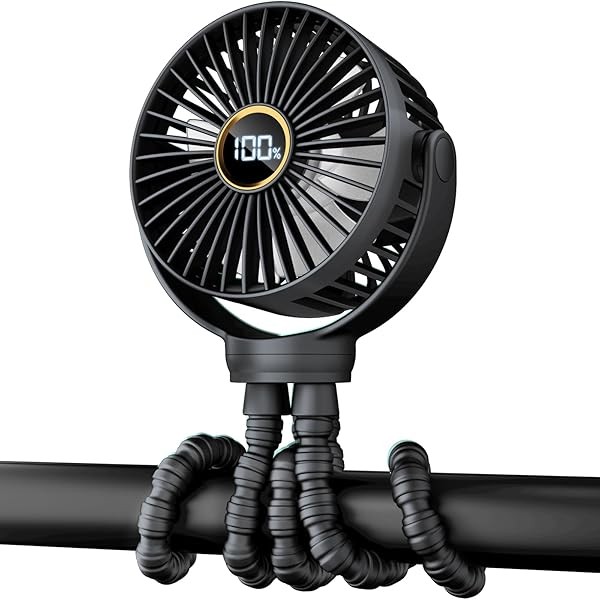 Portable Stroller Mini Fan, Small Rechargeable Personal Cooler w/ 360° Rotation, 3-Speed, Display, Battery Powered Stroller Accessories, Baby Essentials for Car Seat, Crib, Bike, Treadmill, Black