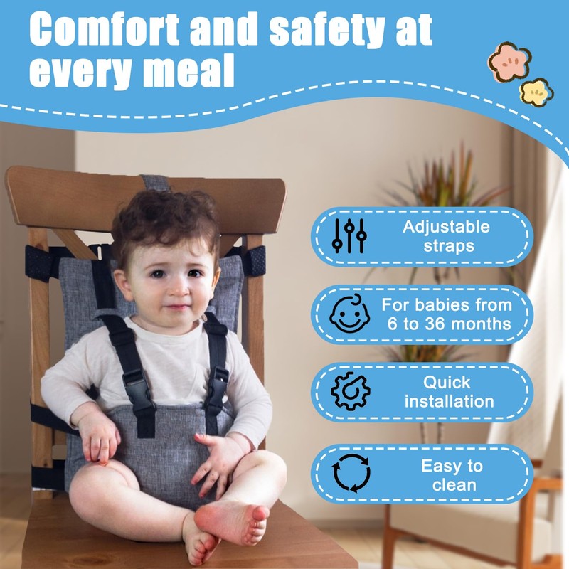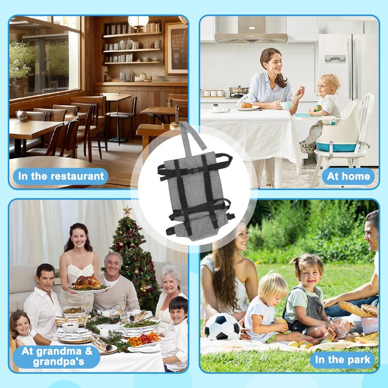 - Universal comfort: fits most standard chairs (with backrest) thanks to the adjustable strap system. Easy to install and remove, it turns any chair into a secure seat for your baby, no matter where you are. Wherever you go, you just need to take this portable high chair safety seat bag. Quickly converts the chair into a baby seat, reduce the trouble of holding your child all the time.