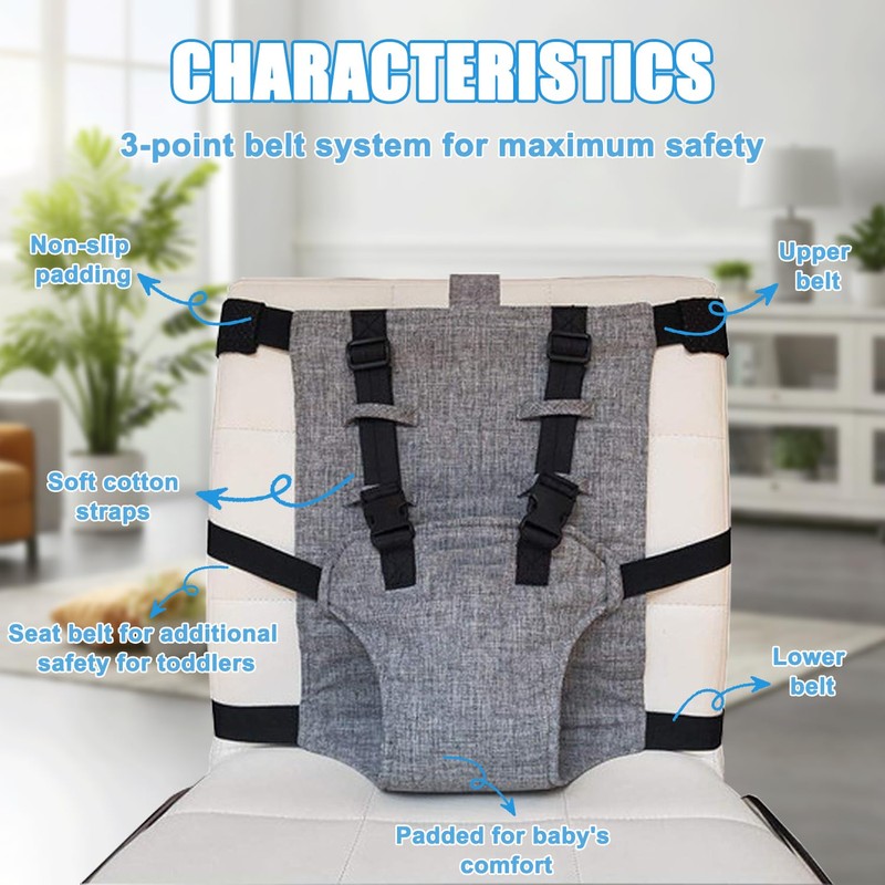 - Stable and safe design: children's seat belt with padded design and soft shoulder straps for maximum comfort for your baby. Non-slip pads along the top strap of the children's high chair foldable protective strap prevent it from slipping/slipping on the backrest of the chair. With 3 side buckle straps, a height-adjustable belt strap and an adjustable waist belt for extra security, you can be safe.