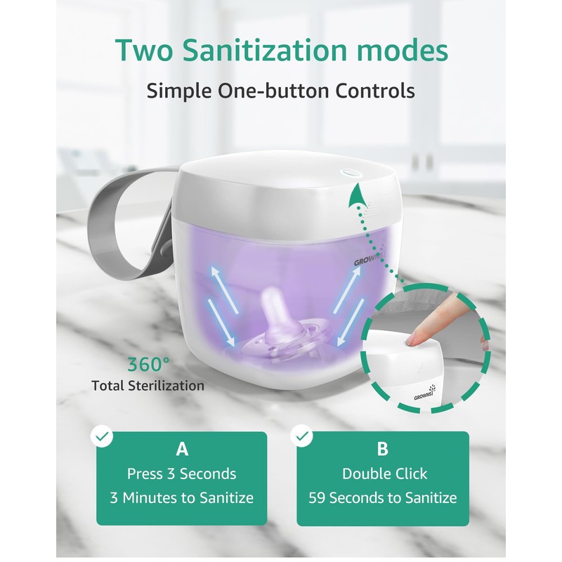 - Strong Lasting Life: Portable parcifier sterilizer on the go. The GROWNSY baby sterilizer for bottles and pacifier can be used for up to 90mins with a single charge. 90 times for 59S sterilizing; 30 times for 3-minutes sterilizing. Recharging by USB, replaced the traditional charging ways, USB cable included.