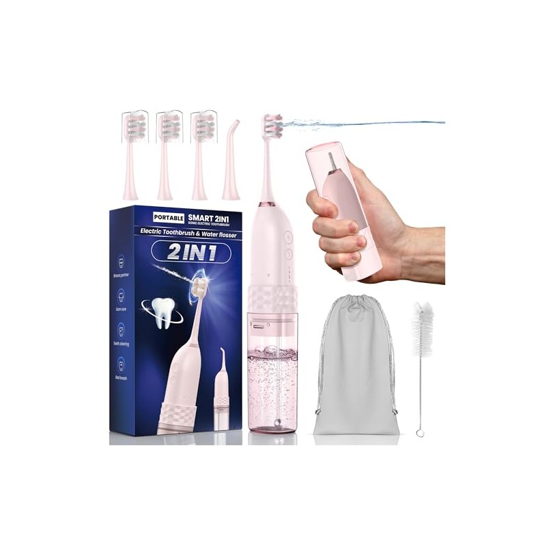 Portable Water flosser with Electric Toothbrush, 2 in 1 Teeth Cleaning Kit, Electric Toothbrush and flosser Combo, Water Flosser for Travel and Home (Pink)