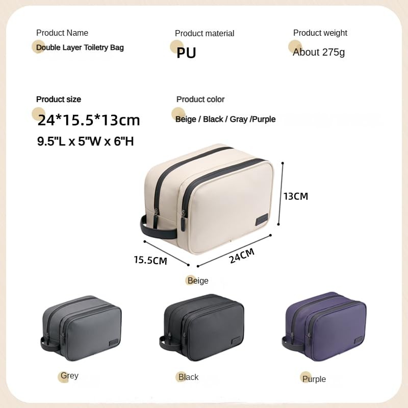 - Double-Layer Organization & Large Capacity Two separated compartments sort small items (lipsticks, earbuds) and bulkier bottles (shampoo, sunscreen) neatly. Ideal for 3-5 day trips, eliminating rummaging chaos and saving time;
