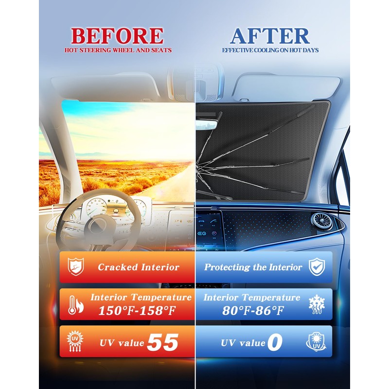 • 【UPGRADED & UNPARALLED SUNSHADE PROTECTION】The unrivaled upgraded shade coating provides you with more all-around shade protection against inclement weather. We've added 2-in-1 Ice Crystal Dual Layer Cooling with titanium silver fabric on the front and vinyl on the back. Safe and easy protection from even the harshest weather (Our products have passed thousands of automotive sunscreen tests and UV +50 tests from 150°F - 170°F). Make your car's temperature maintained at 80°F - 85°F at all times.