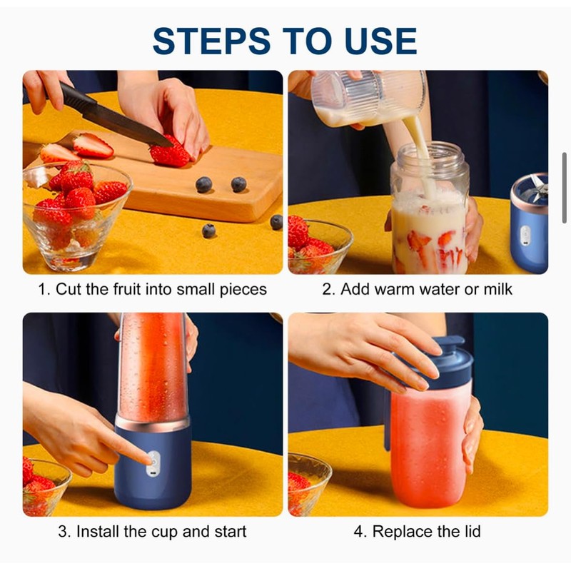 - USAGE STEPS: 1. Cut food in small pieces before blending 2. Add warm water or milk 3. Make cup is Installed correctly before starting the device otherwise it won't turn on 4. Replace the lid