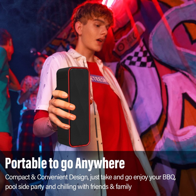 Portable Wireless Bluetooth Stereo Speaker with Powerful Sound 10W Acoustic Drivers Built-in Mic FM Radio Micro SD Card USB AUX-in Slot for Smartphone, PC, MP3 and More DY22-Black/Red