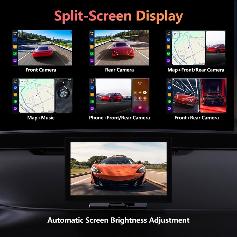 - [Wireless Carplay & Android Auto] Portable carplay screen for car is compatible with CarPlay and Android Auto. You only need to connect your phone to car play (it will automatically connect after initial setup), and you can access navigation, phone contacts, play music, etc. by sending voice commands to Siri & Google Voice Control. You can focus on the road conditions, which are more conducive to safe driving.