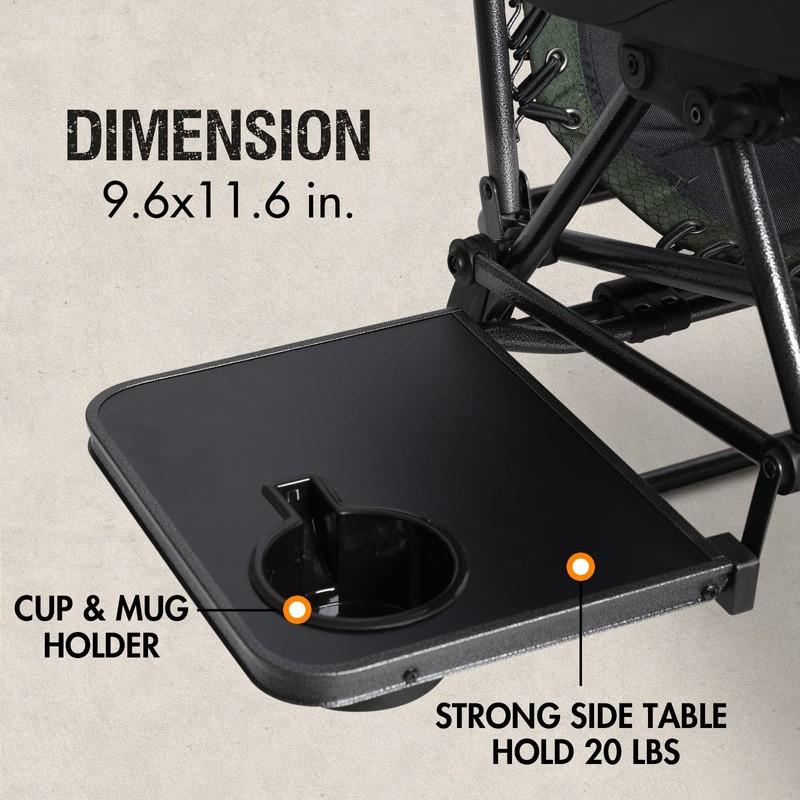 - Utility Gravity Chair: Breathable mesh back connected to padded seats, adjustable padded pillow for both headrest and lumbar support, side table for drinks and phone storage.