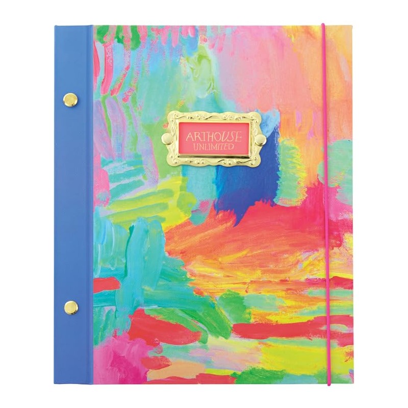 - Arthouse Unlimited hardback B5 notebook measuring 20cm x 25cm, with gold metal rivet closures, elastic closure and gold metal name plate featuring the iconic Arthouse Unlimited logo