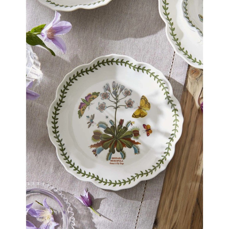Add natural elegance to your meals with the Portmeirion Botanic Garden Lotus Blossom Side Plates, Set of 4, each styled with the beauty of a blooming lotus flower. At 8.8 inches in diameter, these round porcelain plates are perfect for serving desserts, appetizers, or small bites, whether for a casual lunch or formal gathering. At the center of each plate, a striking Venus flytrap illustration bursts with detail and color, framed by vibrant butterflies that emphasize the botanical theme. Crafted from durable porcelain, these plates combine art and utility, with safe use in the microwave, oven, freezer, and dishwasher. Their charming form and nature-inspired design make them ideal for everyday use or special entertaining. As part of the celebrated Botanic Garden Collection by Portmeirion, this set of 4 makes an excellent gift or collectible addition for those who love whimsical, garden-themed tableware with a touch of creative flair. Display them proudly or use them to serve in style—their beauty is as functional as it is striking.