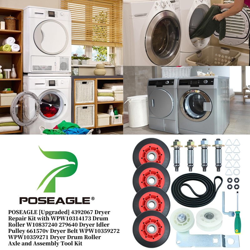POSEAGLE [Upgraded] 4392067 Dryer Repair Kit with WPW10314173 Drum Roller W10837240 279640 Dryer Idler Pulley 661570v Dryer Belt WPW10359272 WPW10359271 Dryer Drum Roller Axle and Assembly Tool Kit