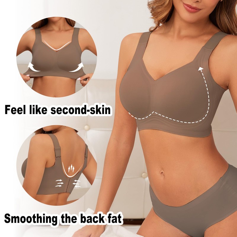 PoseFree Womens Bras No Underwire Full Support Back Fat Smoothing Bralette Wireless Push Up Plus Size Sports Bra (Coffee,3XL)