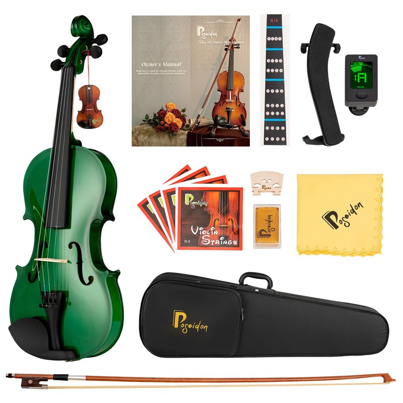 - 🎼【Elegant Design】: Poseidon always committed to manufacture of high-end beginner violins, the purple violin 4/4 size is made of spruce wood panel, maple back board, neck and side plate with glossy green color. Along with an solidwood fingerboard, pegs, pegged chin rest, violin bows and an alloy tailpiece with 4 built-in fine tuners. Additional, the whole violin is handmade entirely by our outstanding crafters. It's a perfect work of art!