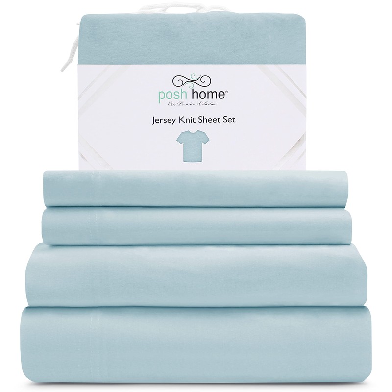 Posh Home Jersey Knit Sheet Set – 4-Piece Jersey Bed Sheets – T-Shirt Breathable & Soft Cotton Jersey Sheets - Includes Flat Sheet, Jersey Fitted Sheet, & 2 Pillowcases - Queen Jersey Sheets, Sky Blue