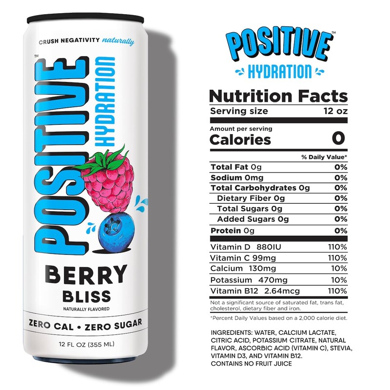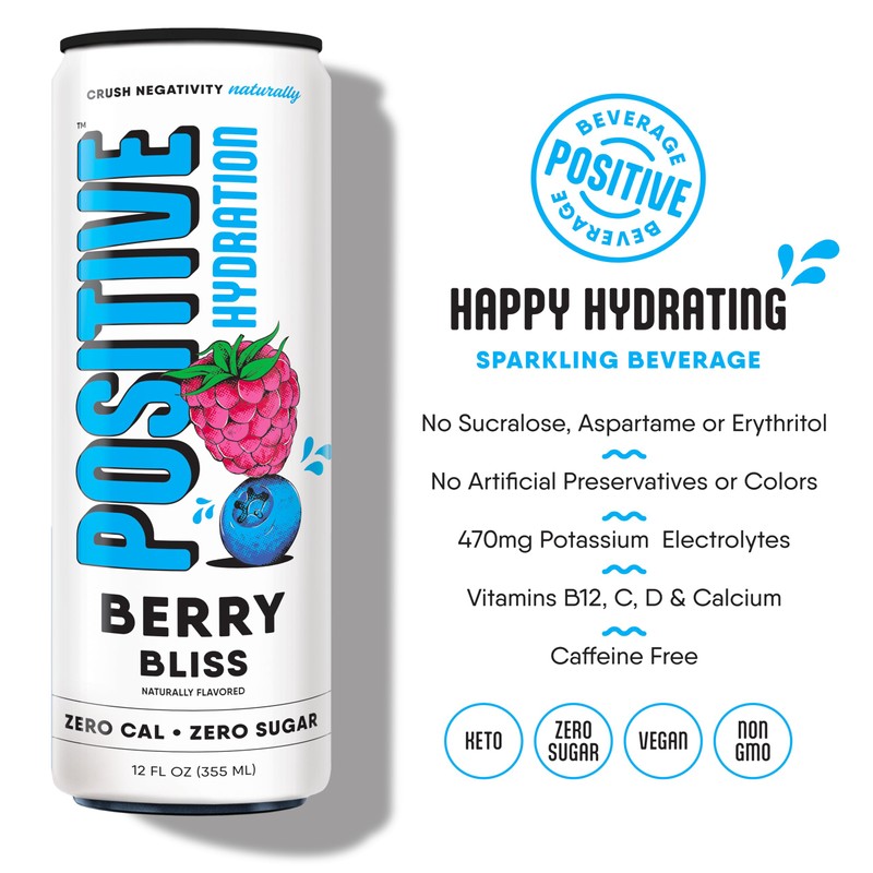 Positive Hydration Berry Bliss | 12-oz Cans (12-Pack) | Zero-Calorie Electrol...
