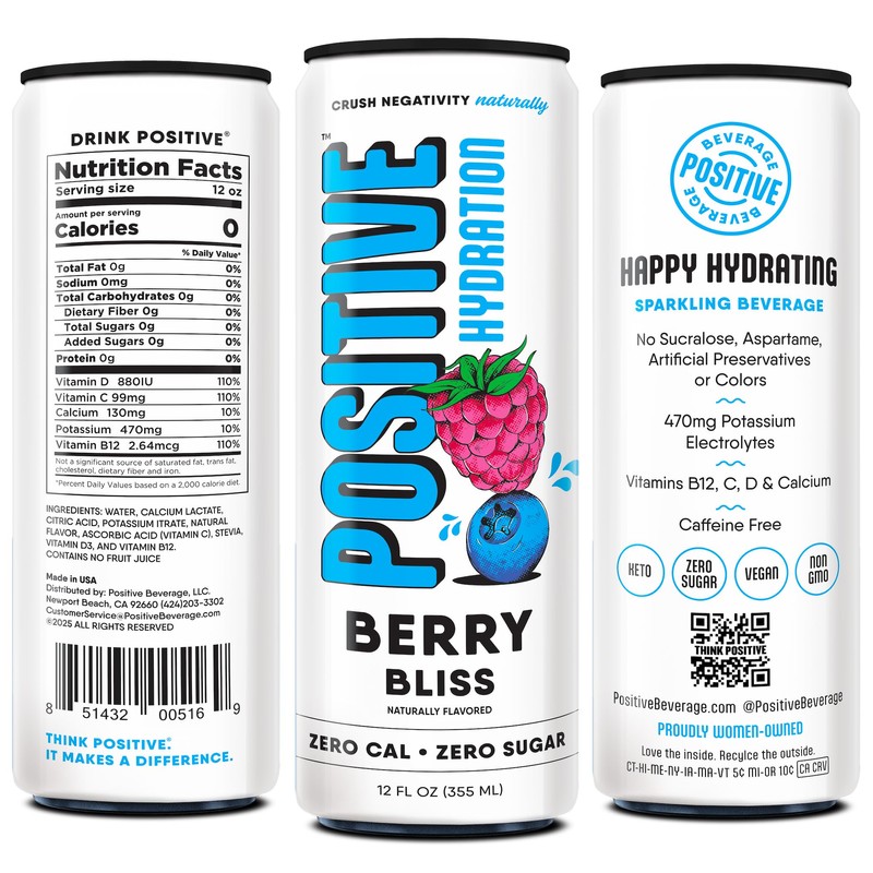 Positive Hydration Berry Bliss | 12-oz Cans (12-Pack) | Zero-Calorie Electrolyte Drink with Essential Vitamins, Calcium, and Hydration Support