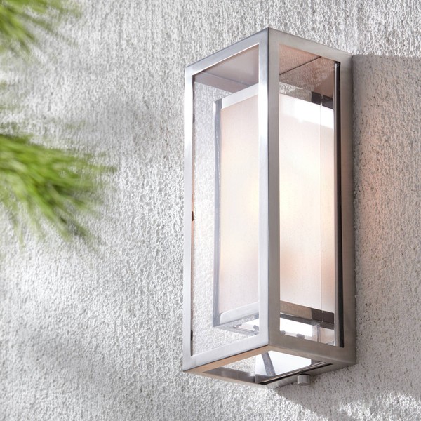 From Possini Euro Design, this gorgeous upright wall fixture features an outer frame of chrome finish metal and clear glass. Inside, a second frame shade is made of frosted seedy glass and chrome. Together, they create one magnificent wall light that will enhance your home's style. This design is wet rated for outdoor use.