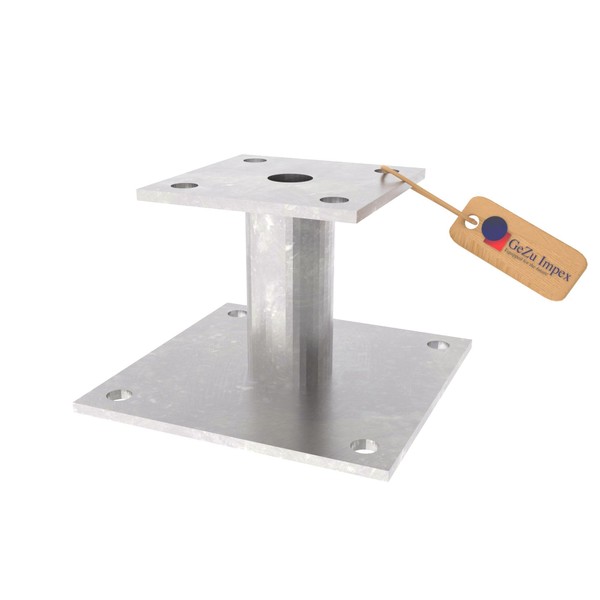 - Technical details: height: 50 mm, support plate: 100 x 100 mm, material thickness support plate: 5 mm, base plate: 100 x 100 mm, material thickness base plate: 5 mm, holes: 8 holes Ø 10 mm, material type: hot-dip galvanised steel