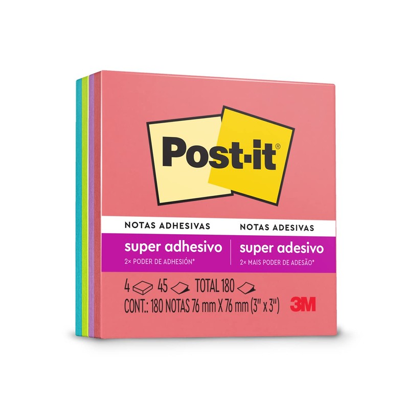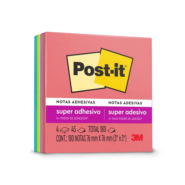 Post-it Notas Súper Adhesivas, Doble poder de adhesión, Colores Neón, 7.6cm x 7.6 cm, 4 pads, 45 hojas por pad