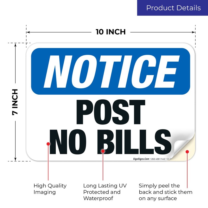 Post No Bills Sign, OSHA Notice Sign, 10x7 Inches, 4 Mil Vinyl Decal Stickers...