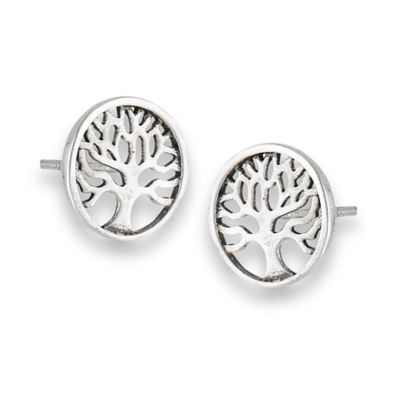 Post Tree Of Life Round .925 Sterling Silver Minimalist Stud Branch Circle Ea...