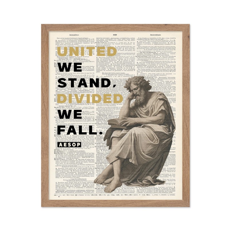 Poster Master United We Stand Poster - Aesop Print - Motivational Art - Unity Quotes Art - Encouraging Art - Gift for Men & Women - Inspiring Decor for Living Room or Office, 11x14 Beige Framed