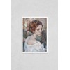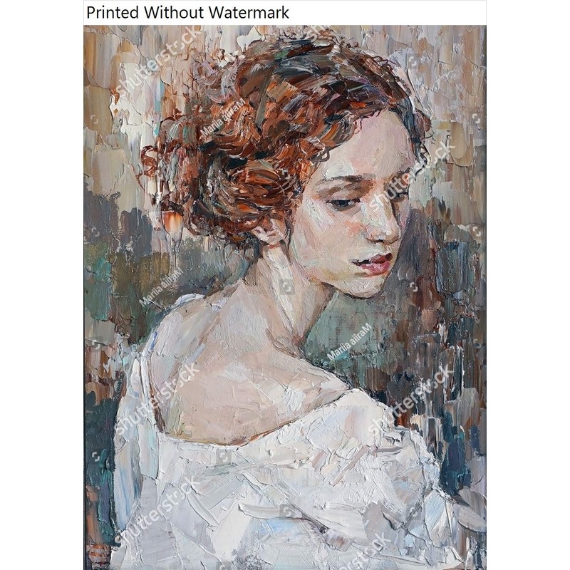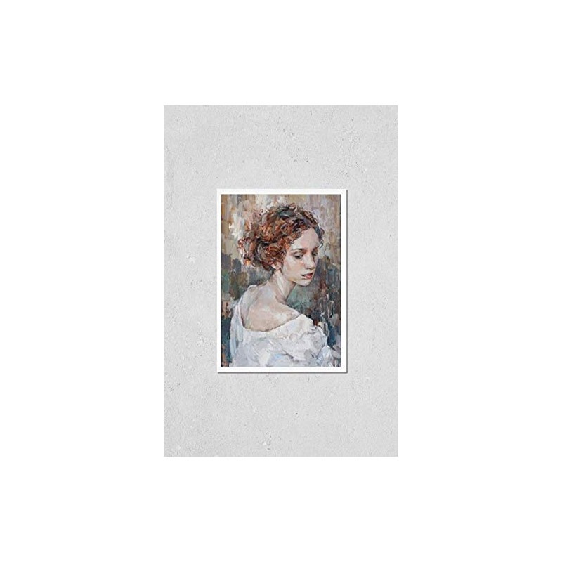 Poster Reproduction of Portrait of a young, dreamy girl with curly brown hair on a mysterious abstract background. She looks very mystical and thoughtful. Palette knife technique of oil painting
