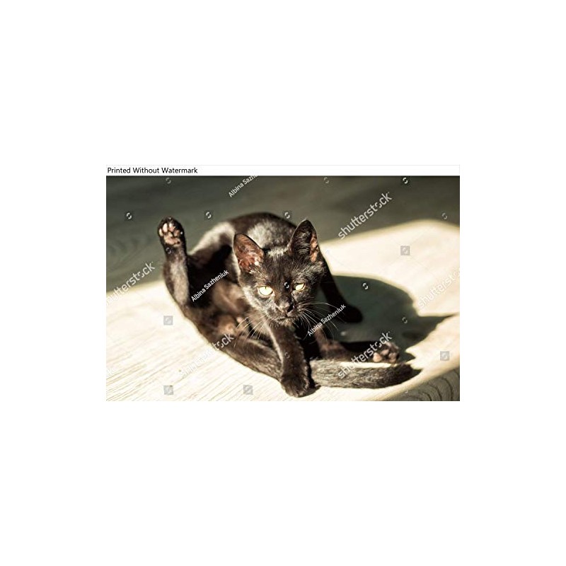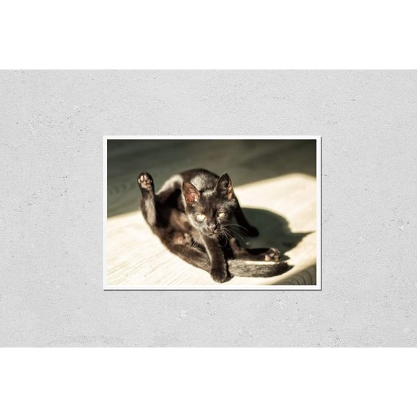 Poster Reproduction of Young black short-haired cat interrupted during licking his tail and looking in camera in sun light in sunny day. Domestic cat during washing. Funny black cat with paw up